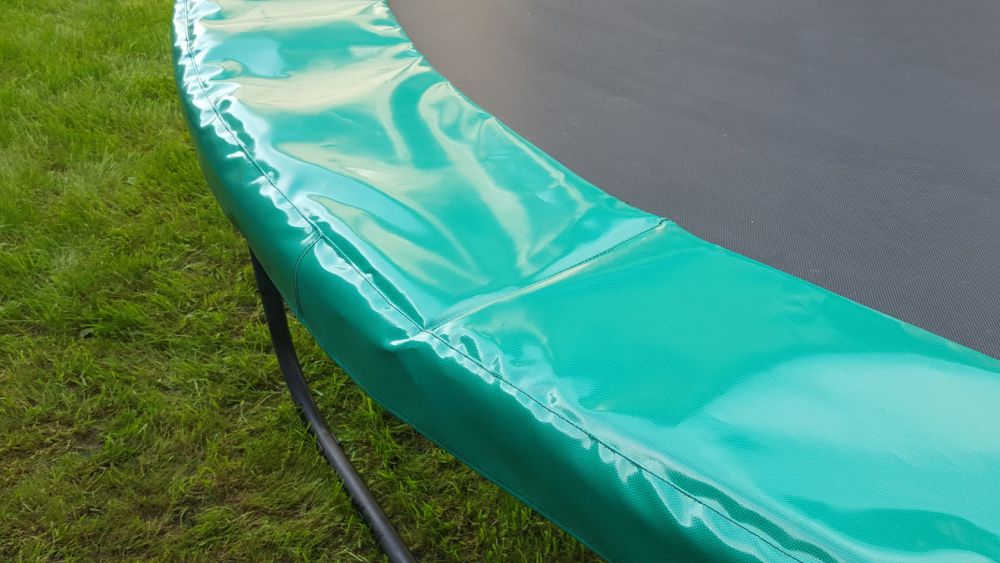 У нас вы можете купить защитный чехол для пружин батута 12ft. Такой мат подойдёт для диаметра батута 366 см, а его ширина составляет 28 см. Мат имеет зелёный цвет, выполнен он в форме кольца. Для изготовления защитного мата мы использовали ПВХ ткань с плотностью 380 г/метр, ткань может быть синей или зелёной. Наполнен мат вспененным пенополистиролом, а закрепляется он специальными завязками, изготовленными из стропы. Перед приобретением мата мы рекомендуем вам измерить диаметр каркаса батута, а также расстояние от прыжкового полотна до края каркаса батута.